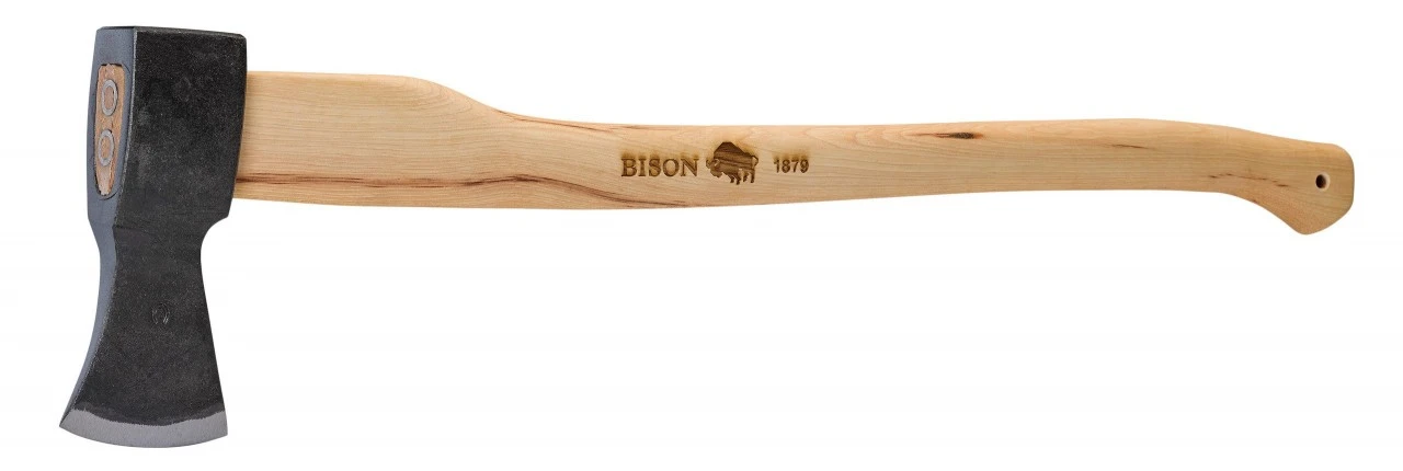 Bison 1879-serien – økse af kvalitetsstål håndsmedet efter gammel håndværkstradition. En massiv økse med et tungt hoved og speciel, hvælvet hovedform, der giver enorm kløvekraft, også til tykke kævler. Æggen er mellemskarp og slibningen let hvælvet – giver stor kløveenergi og langvarig formbestandighed. Det massive, lige skaft trykker det øverste af æggen i først, hvilket understøtter kløvningen yderligere. Det helt naturlige hickoryskaft er særligt venligt mod hænderne og giver godt greb takket være en ferniseret overflade. Hver økse leveres med en robust ægbeskytter af læder og kun original med den ægte BISON.