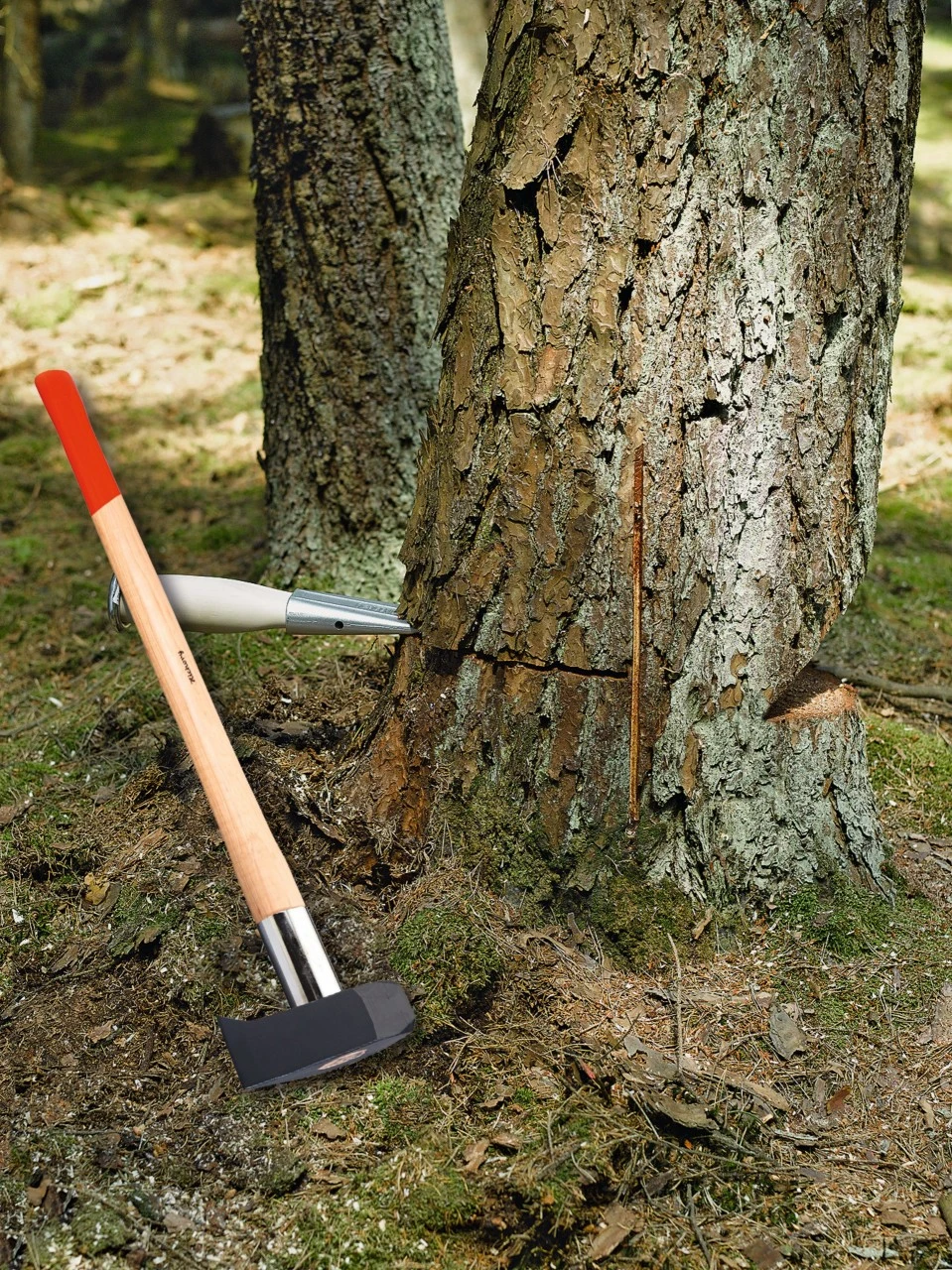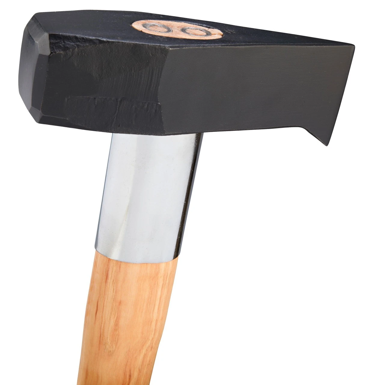 Hoved med vendenæse, ekstremt kileformet, til kløvning af mellem- til meget tykke stammer.Hammerside 54 x 54 mm til inddrivning af kiler. Komplet med 85-cm langt, lakeret hickoryskaft og skaftbeskyttelseshylster. Hovedets vægt 3000 g.