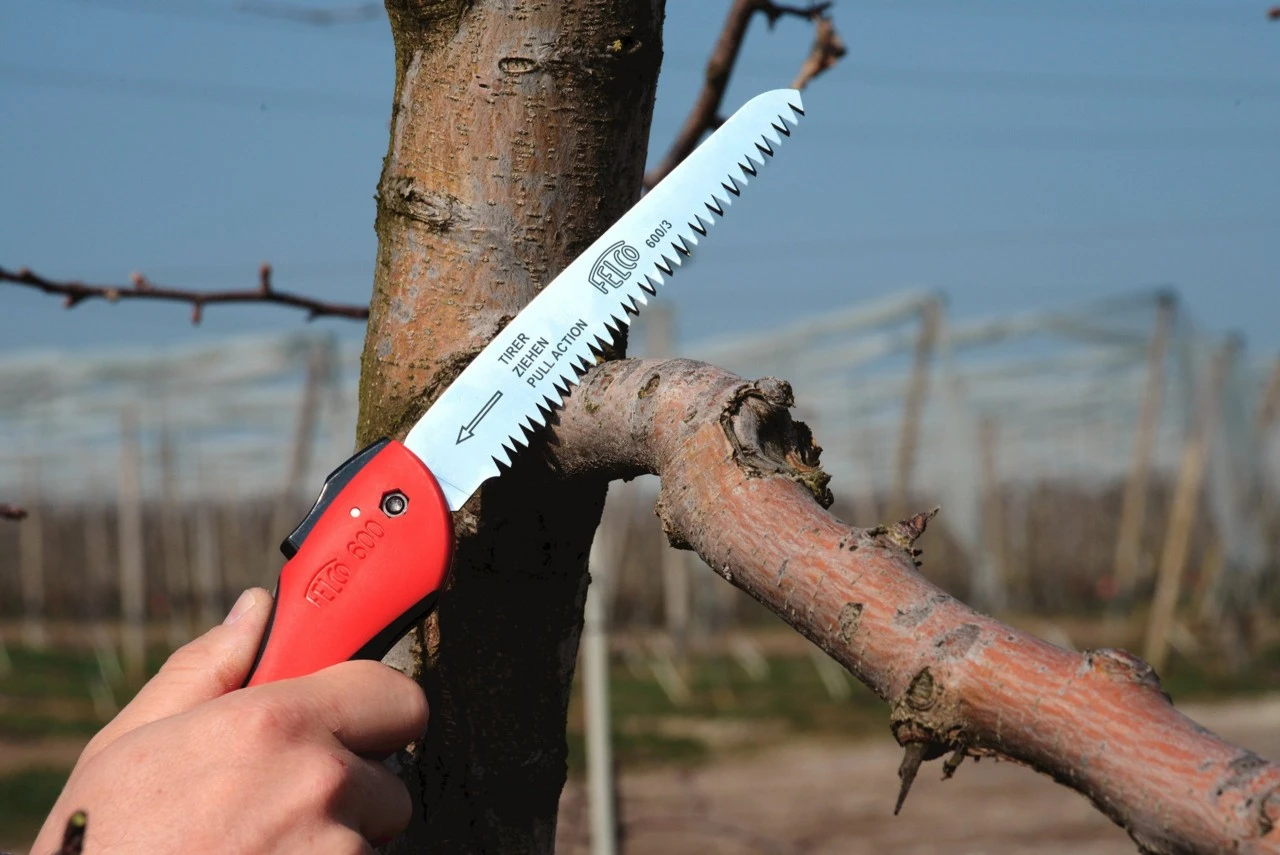 Felco foldesav. Træsav med kniv-skarpe tænder. Tændernes specielle koniske form forhindre at sav- sporet klemmer om saven og sprækker. Blad af forkromet rustfri-stål. Bladlængde 160 mm. Vægt 165 g