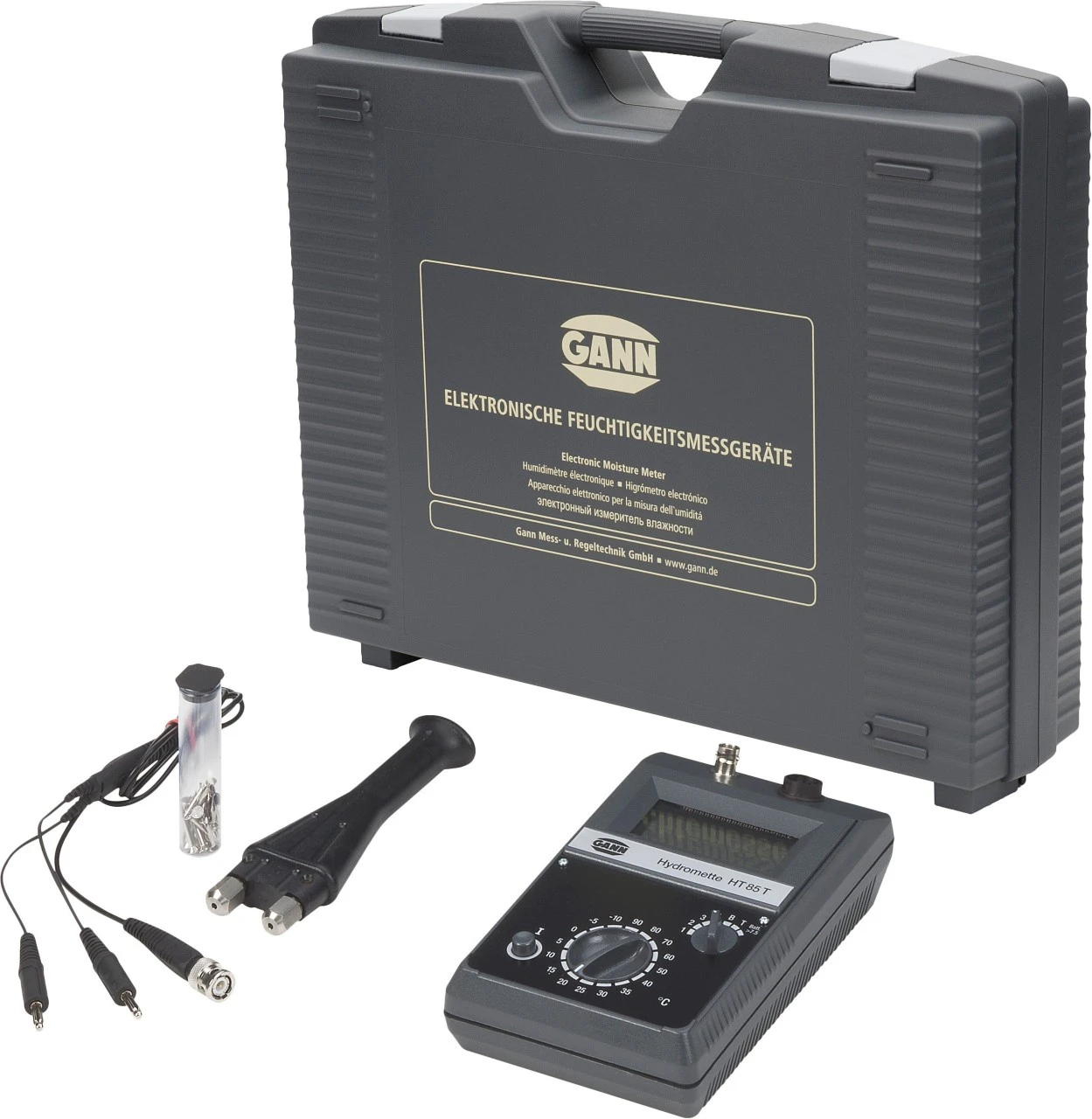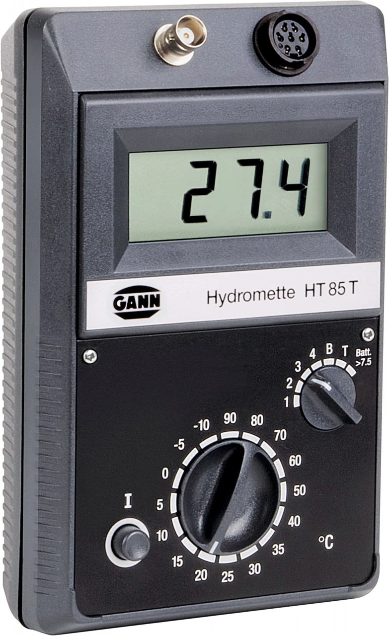 Gann Hydromette HT 85 T er et elektronisk måleapparat til bestemmelse af fugtindhold i træ og byggematerialer. Det muliggør præcise målinger af savet træ, spånplader, finer, træflis og andre bulkmaterialer samt fæstede byggematerialer. Det store måleområde er særdeles velegnet til individuelle målinger af træarealer og til målinger efter diverse forarbejdningstrin.