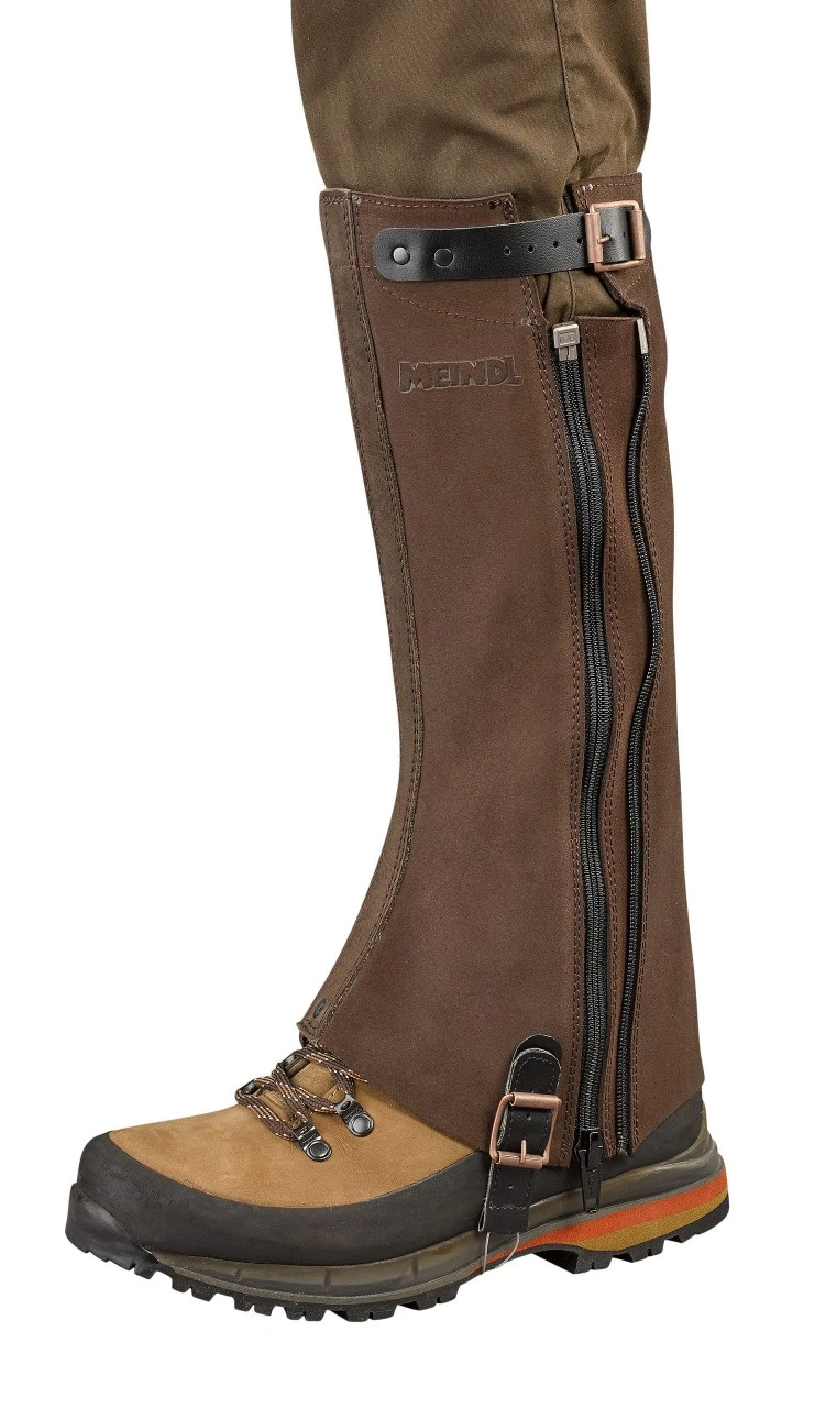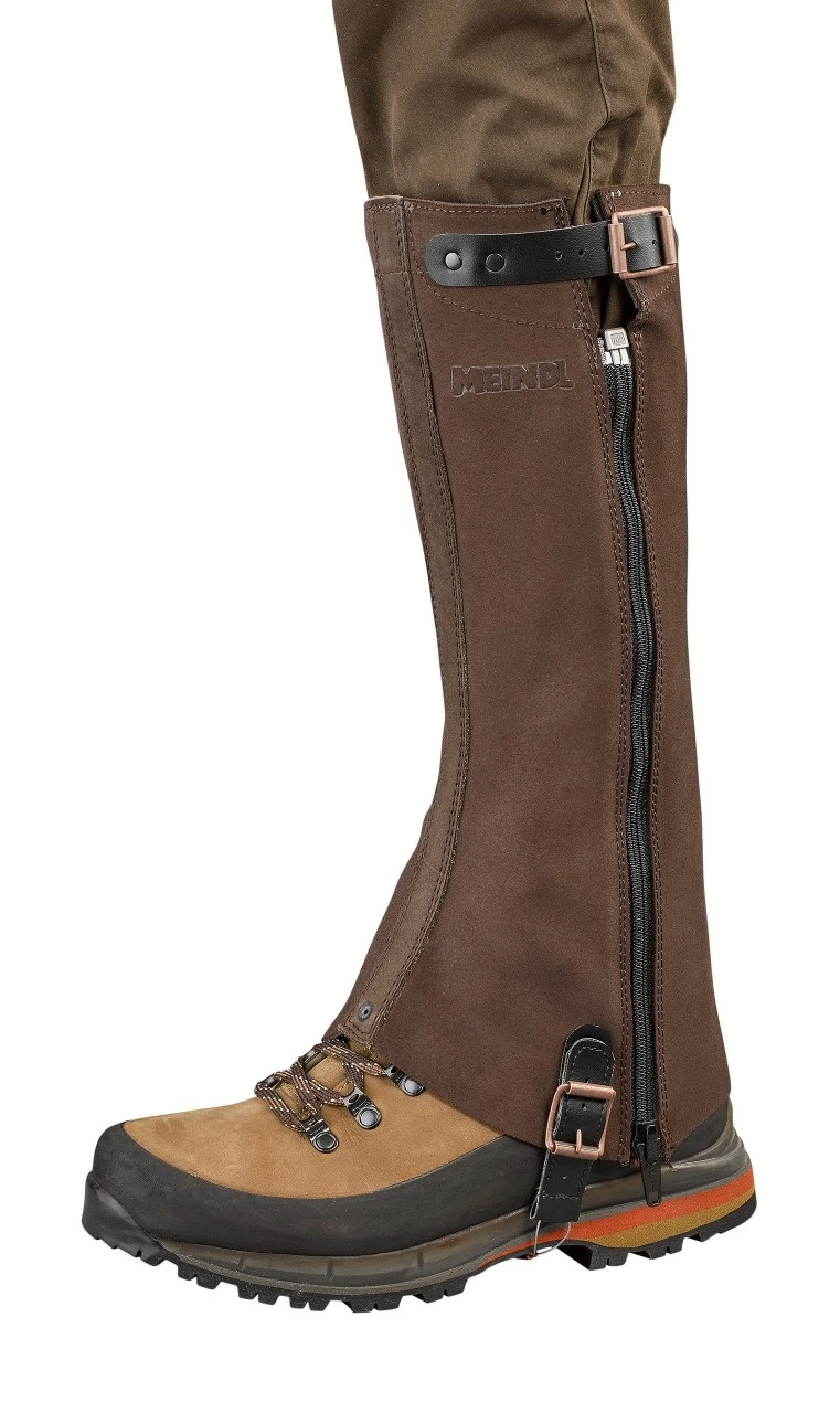 Læderet er behandlet og meget vandafvisende. Således giver Meindls gamacher den bedste beskyttelse mod fugt og snavs, men også mod irriterende brombærtorne. To fine lynlåse giver mulighed for at justere benbredden.