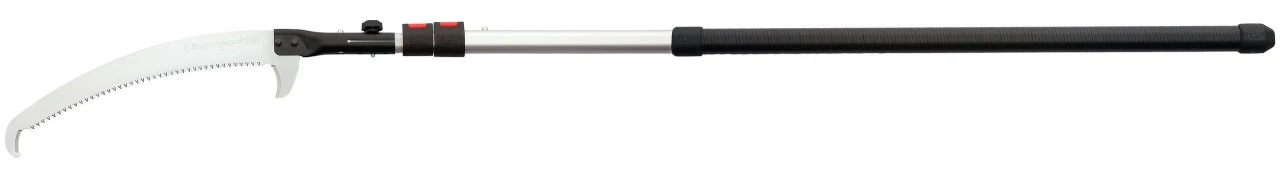 FPA-godkendt opkvistnings-sav, med grov tanding. Brugbar til alle beskæring´s opgaver. Passer kun på Silky stænger. Komplet med kraftig kunststofskede til transport beskyttelse. Teleskopstang af aluminiumsrør. Længdeindstilling med trykknaplåse. Udstyret med klemringe, som stabiliserer stangen. Med 85 cm langt gummi-overtræk som giver et godt greb. Tandvidde 4,6 mm, savlængde 400 mm. Leveres i stabilt hylster til saven. Med monteret sav skal der tillægges 50 cm til ovenstående mål.