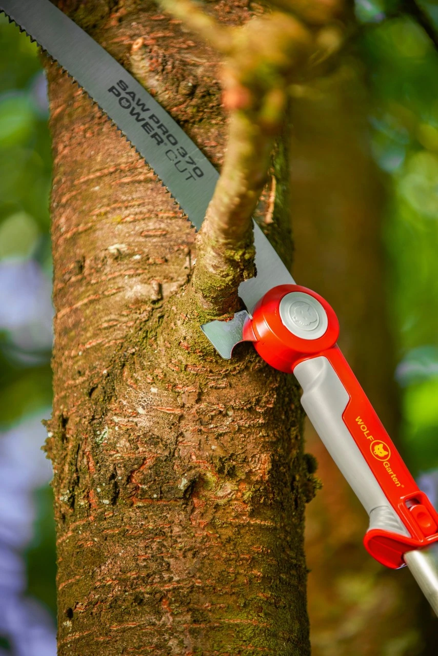 Grensav med krummet savblad og ergonomisk formet greb for effektiv savning. Savtænderne arbejder ved træk. En særlig egenskab for denne sav er den integrerede grenkrog til at trække afsavede grene eller dødt træ frem. En stødkniv i den anden ende skærer i barken og forhindrer på den måde uønsket nedrivning af grene på træet. Glidestoppet MaxControl sørger for sikkert arbejde. Med vario-skafterne fra tilbehørsprogrammet kan Wolf Power Cut Pro 370 også opgraderes til en fuld topsav til hobbygartnere.